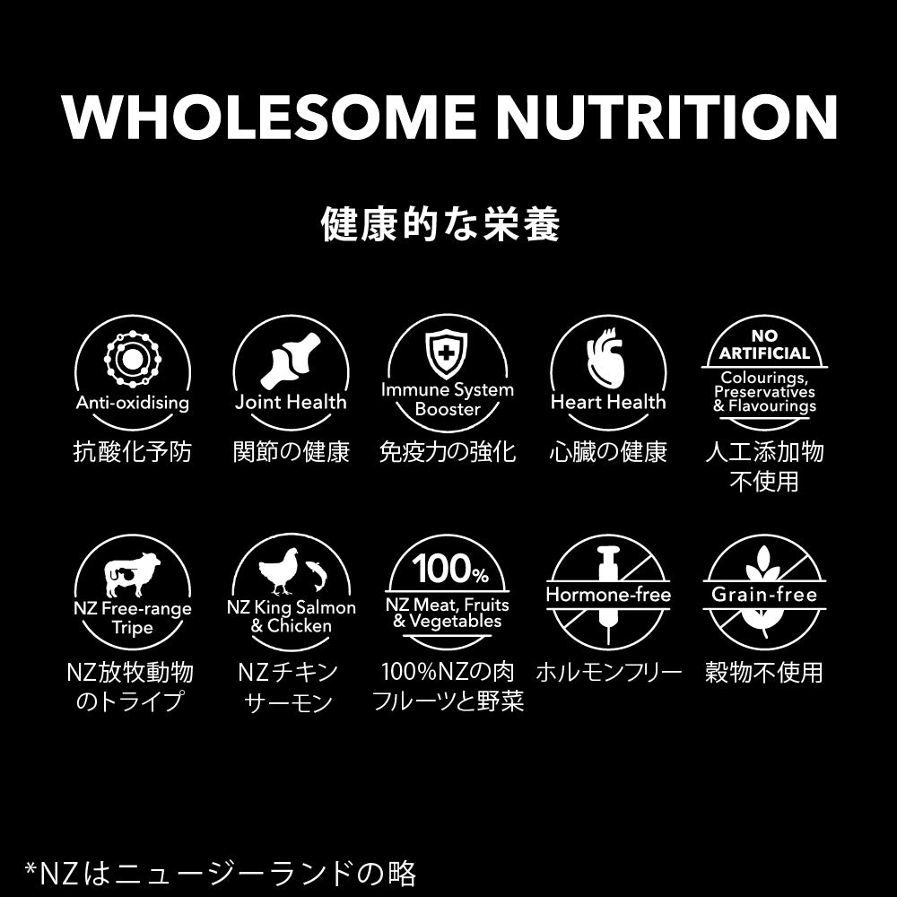 ニュージーランド産のキングサーモンとチキンをバランスよくブレンドし、スーパーフードの栄養素を豊富に含んでいます。