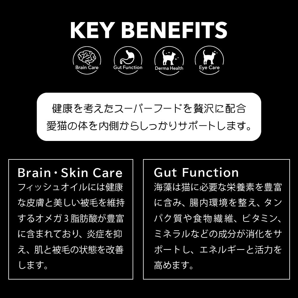 さらに、DHAを含む魚油、栄養豊富な海藻、健康をサポートするキウイフルーツなどのスーパーフードをプラスし、猫の健康と活力を育む栄養バランスを実現しました。