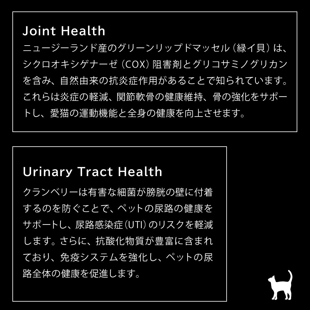 クランベリーは、有害な菌が膀胱の壁に付着するのを防ぎ、尿路感染症(UTI)の予防に役立ちます。抗酸化成分も豊富で、免疫力を高めながら、ペットの尿路全体の健康をサポートします。