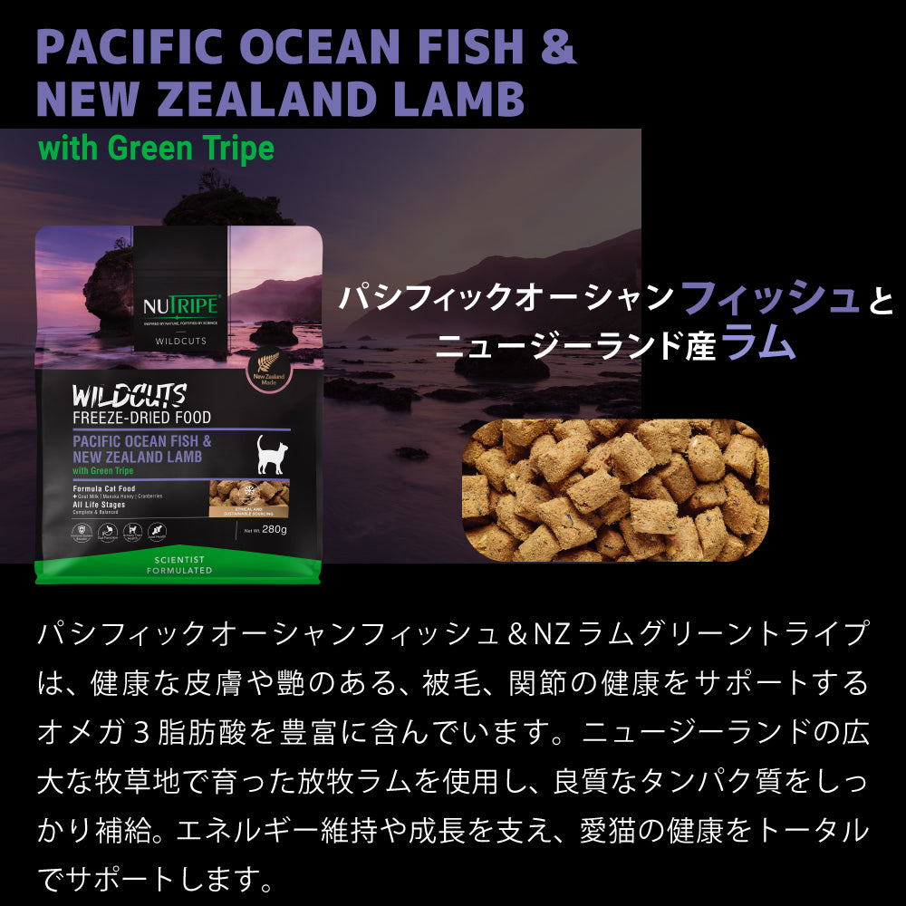 ・原材料:ビンナガマグロ、ラム肉、キングサーモン、グリーンラムトライプ、ホキ、ラムレバー、ラムラング(肺)、緑イ貝、亜麻仁、フィッシュオイル、ヤギミルクパウダー、クランベリー、ニンジン、カボチャ、塩化コリン、マヌカハニー、塩化ナトリウム、タウリン、炭酸カルシウム、混合トコフェロール、塩化カリウム、鉄、ビタミンE、亜鉛、ビタミンB3、銅、ビタミンB1、ビタミンA、セレン、ビタミンB2、ビタミンB5、マンガン、ビタミンD3、 ビタミンB6、ビオチン、ビタミンB12、ビタミンK1、ヨウ素、葉酸