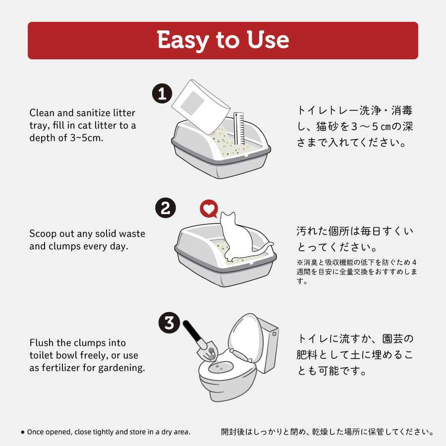 ・猫が慣れない場合は、以前にご使用の猫砂に混ぜて少しずつ切り替えてください。