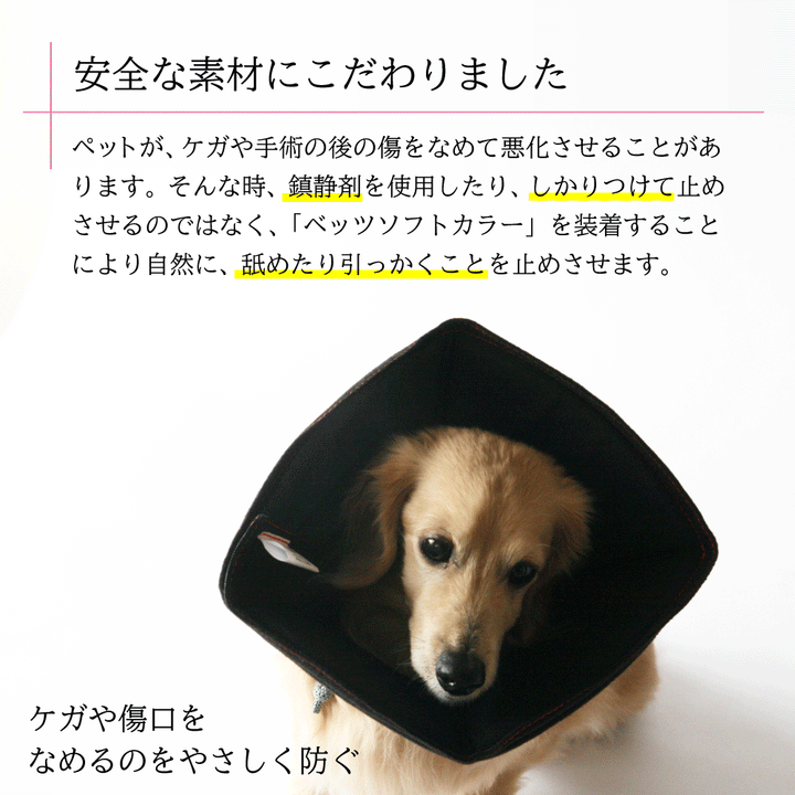 ●ケガや手術後に、傷口をなめたりひっかいたりする事をやめさせ、悪化をやさしく防ぎます。