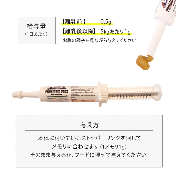 ■給与量(1日あたり):【離乳前】0.5g、【離乳後以降】5kgあたり1g (お腹の調子を見ながら与えてください。)