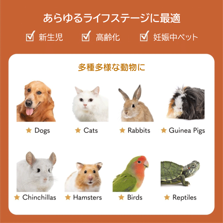 ※犬、猫はもちろん、ウサギ、モルモット、チンチラ、ハムスター、鳥、爬虫類にも使用できます。