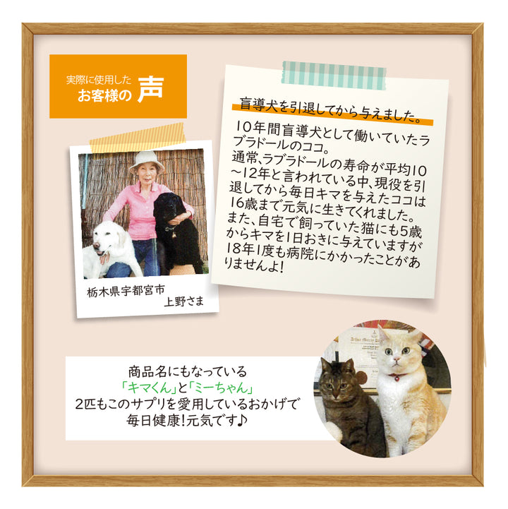 この20年、多くの「キマ」ご愛用者様に喜ばれて現在に至っており、更にペット向けに数年前より臨床体験を重ね、この度ペット用にサプリメントを完成させました。