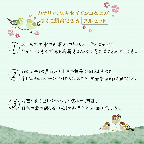 360度全ての角度から小鳥の様子が伺えますので、楽しくコミュニケーションしたり眺めたり、安全管理も行き届きます。