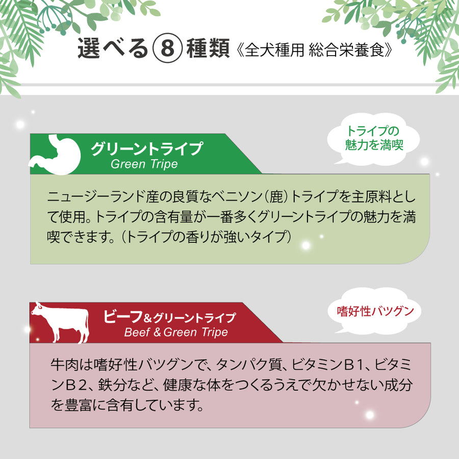 ニュージーランド産の良質なベニソン(鹿)トライプを主原料として使用。トライプの含有量が一番多く、グリーントライプの魅力を満喫できます。(トライプの香りが強いタイプ)