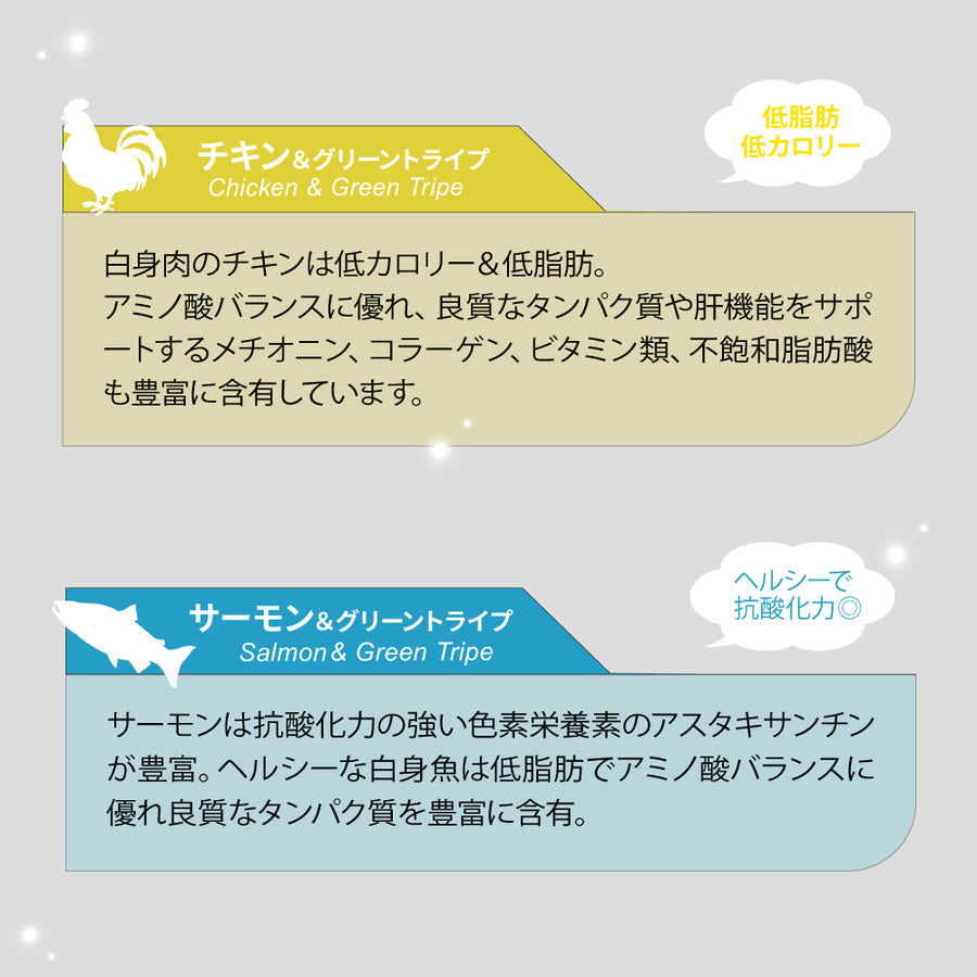 グリーンベニソントライプ、ラムラング(肺)、サーモン、ラムレバー(肝臓)、ポテトスターチ、羊血漿成分、乾燥酵母、緑イ貝、炭酸カルシウム、ピロリン酸四ナトリウム、ヤギミルク、ひまわり油、クランベリー、塩化カリウム、ドライケルプ、塩化コリン、鉄プロテイン、亜鉛アミノ酸複合体、ユッカシジゲラエキス、ビタミンB3、ビタミンE、セレン酵母、マンガンプロテイン、銅アミノ酸複合体、ビタミンB1、 ビタミンB5、ビタミンB2、ビタミンB6、ビタミンA、ビタミンB7、ビタミンB12、ヨウ素酸カルシウム、ビタミンB9、ビタミンD3